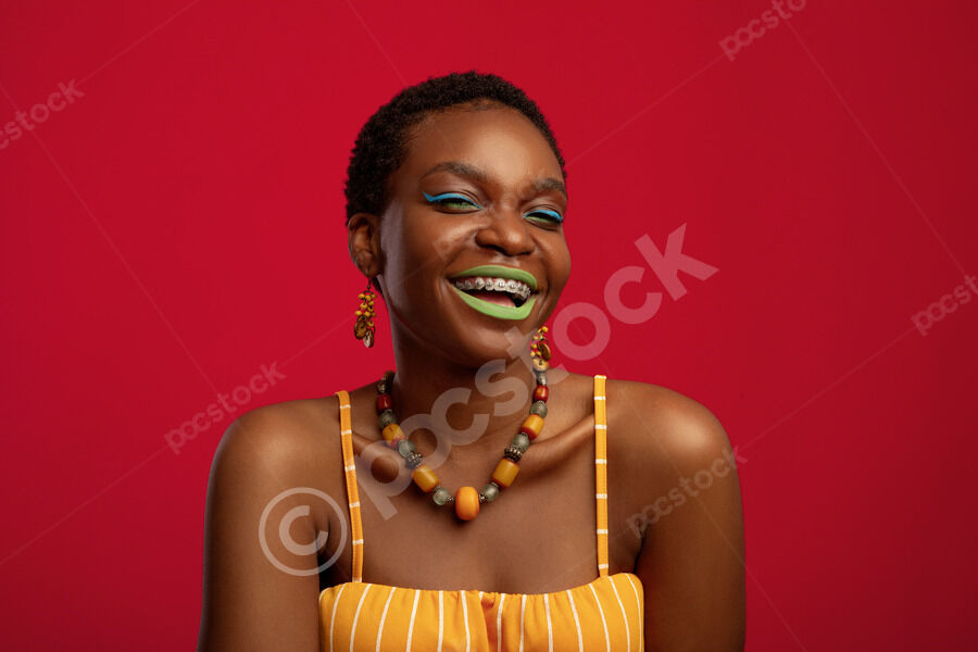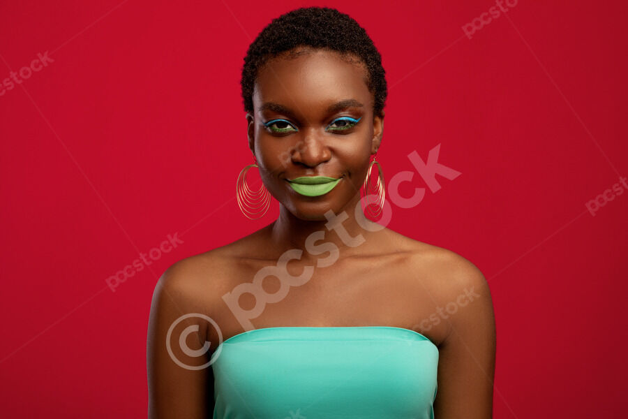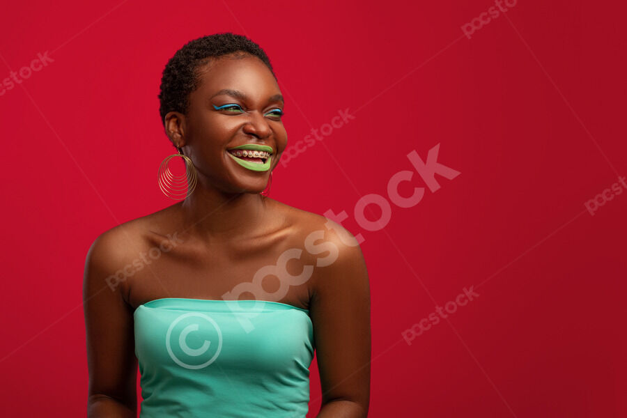 Cheerful Black woman with short hair hlooking away standing in front of red background in studio