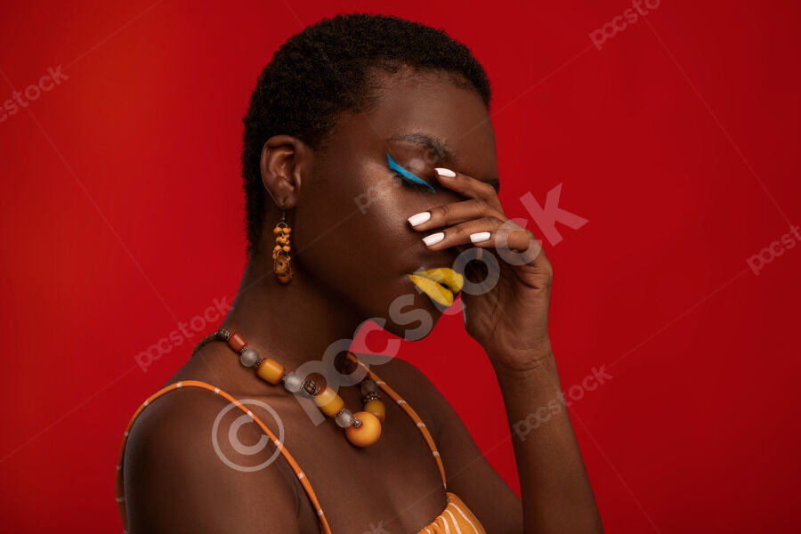 Black woman with short hair covering her face with hand while standing with closed eyes in front of red background in studio
