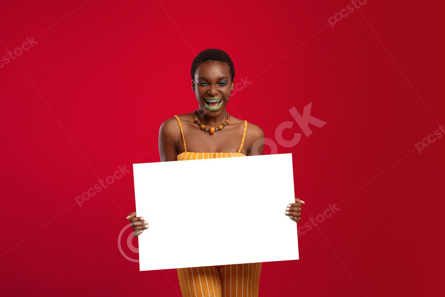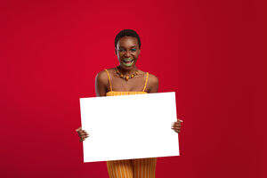 Smiling Black womanwith short hair holding blank board while standing against red background in studio