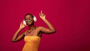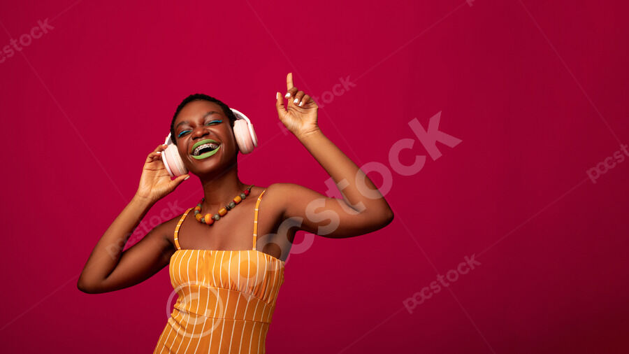 Smiling Black woman with short hair listening to music on headphones and dancing with closed eyes in front of red background in studio