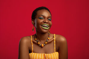 Smiling Black woman with short hair standing with closed eyes in front of yellow background in studio