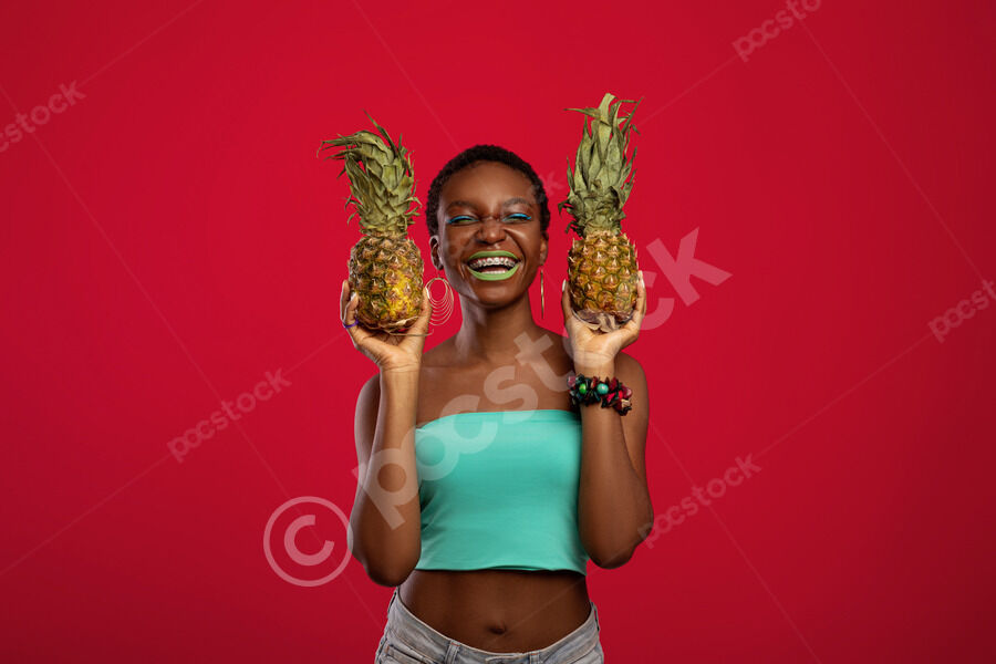 Cheerful Black woman with short hair holding pineapples while standing with closed eyes against red background in studio