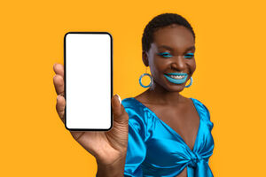 Cheerful Black woman with short hair holding and showing smartphone screen while standing against yellow background in studio