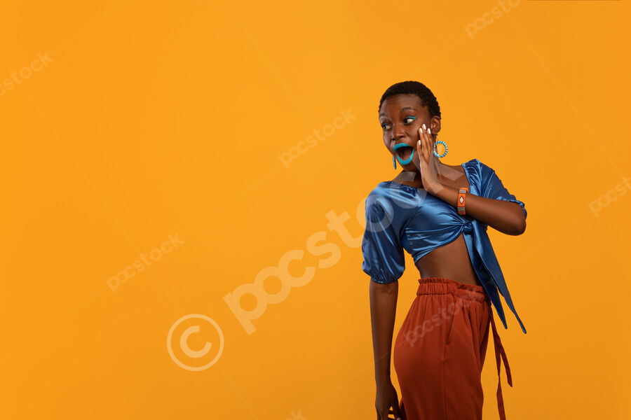 Cheerful Black woman with short hair looking sideways touching her face with mouth open while standing against yellow background in studio