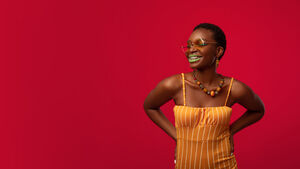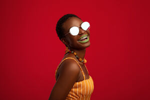 Smiling Black woman with short hair wearing sunglasses standing against red background in studio