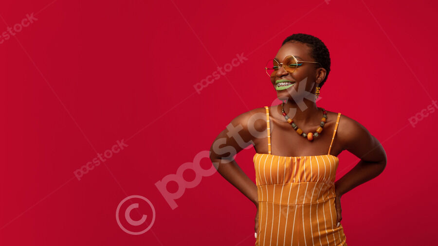 Cheerful Black woman with short hair wearing sunglasses standing with hands on her waist against red background in studio