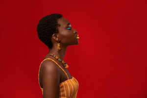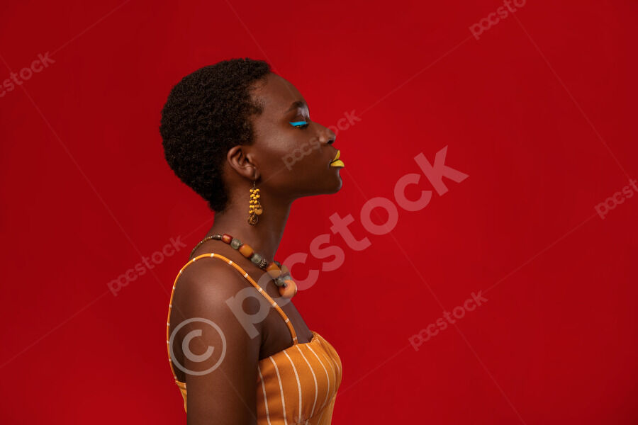 Side view of Black woman with short hair standing with closed eyes in front of red background in studio