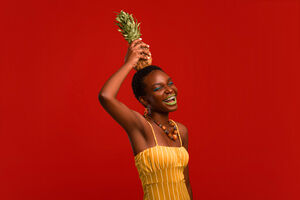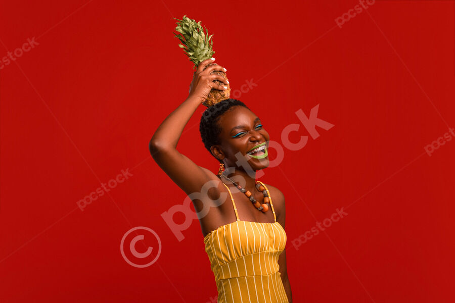 Smiling Black woman with short hair holding pineapple overhead while standing with closed eyes against red background in studio