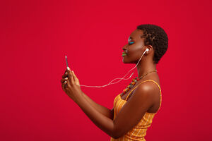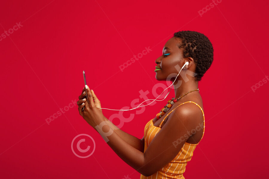 Side view of Black woman with short hair listening to music on headset and holding smartphone while standing in front of red background in studio