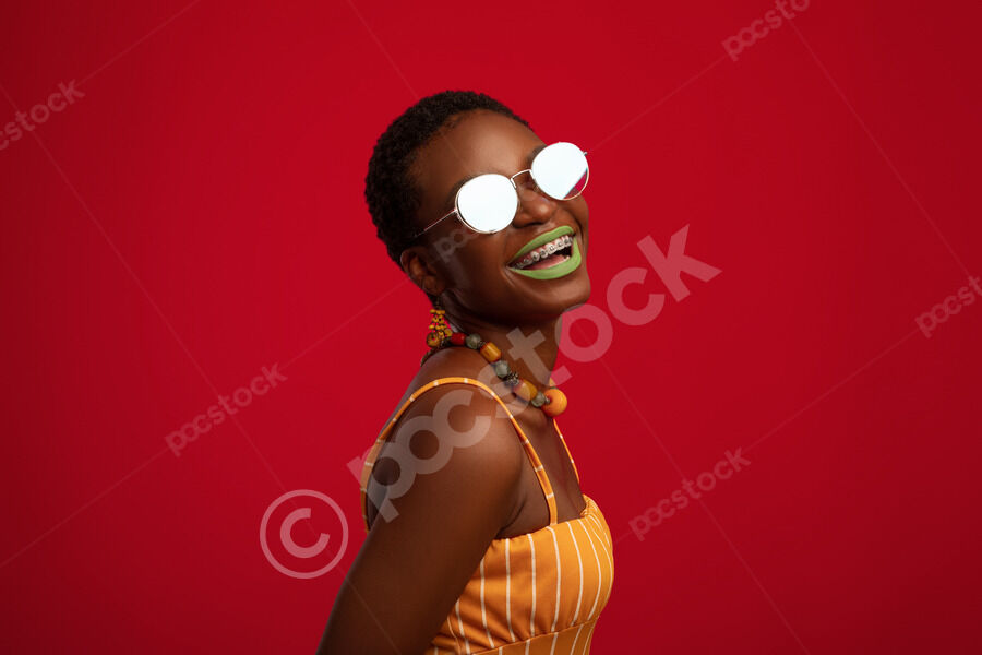 Cheerful Black woman with short hair wearing sunglasses standing in front of red background in studio