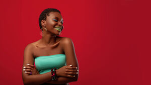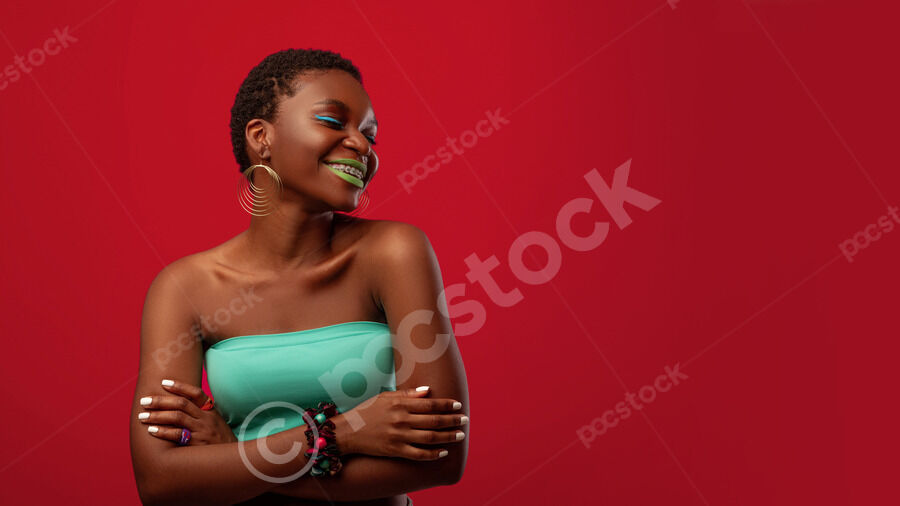 Smiling Black woman with short hair and arms crossed over her chest while standing with closed eyes against red background in studio