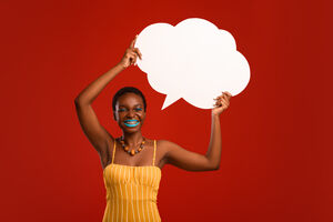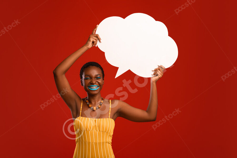 Smiling Black woman with short hair holding empty speech bubble overhead while standing against red background in studio