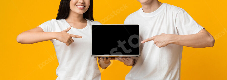 Black Muslim woman wearing hijab pointing finger on laptop while standing against yellow background in studio