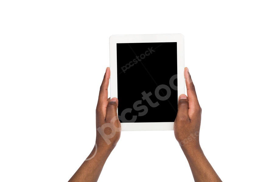 Hands of Black man holding and using tablet against white background in studio