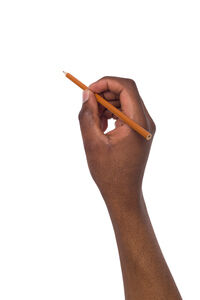 Hand of Black man picking up some items against white background in studio