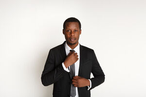 Black man wearing suit fixing necktie standing against white background