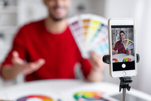 Black pregnant wife touching belly and reading book while sitting on chair near husband chopping vegetables while standing in kitchen at home