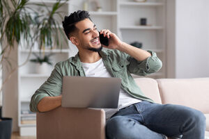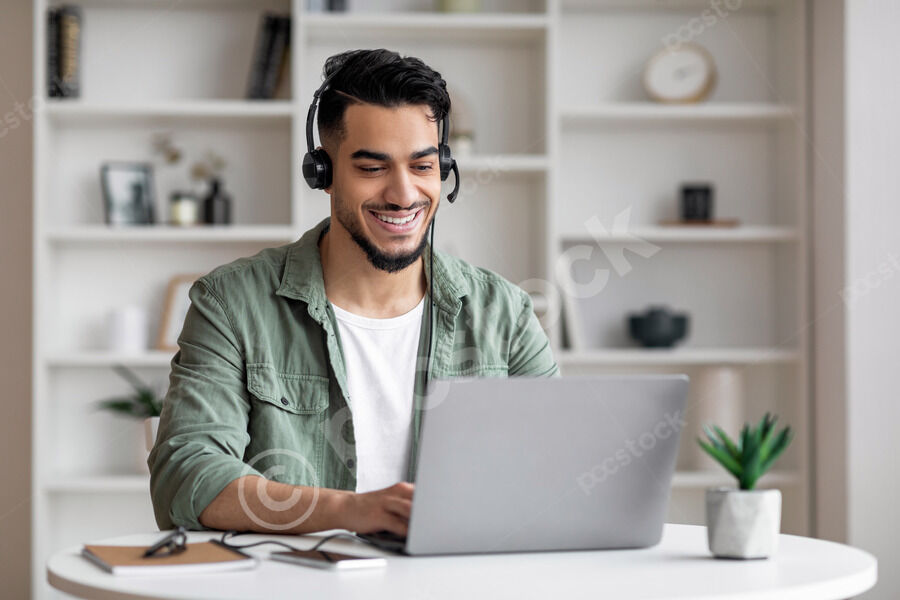 Smiling Middle Eastern woman wearing hijab talking to smartphone while driving car during daytime