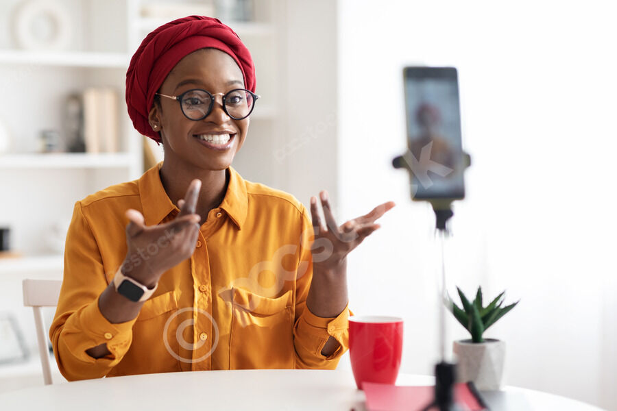 Arab Muslim woman wearing hijab gesturing her hands while standing in kitchen at home