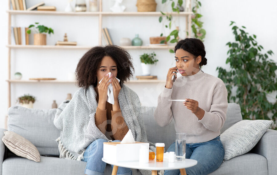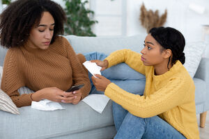 Black female office employee covering ears sitting beside shouting colleagues at desk in office