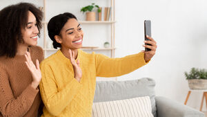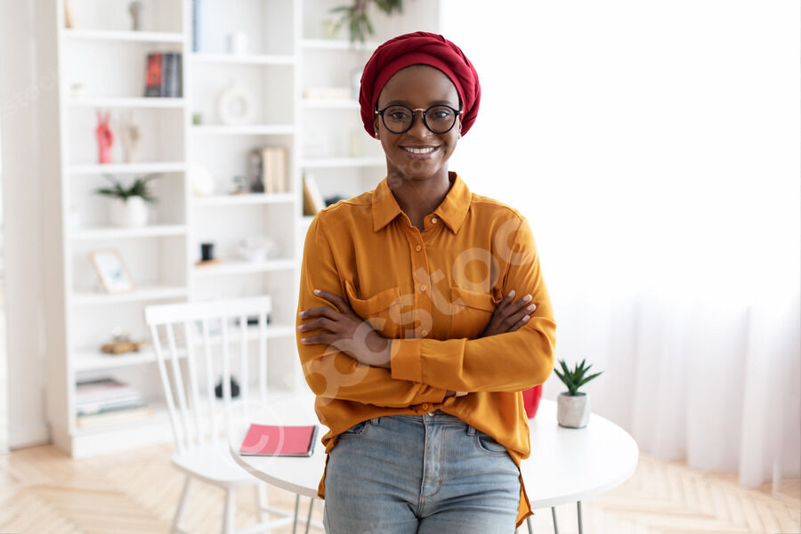 Smiling Arab Muslim woman wearing hijab waving her hand while standing in kitchen at home