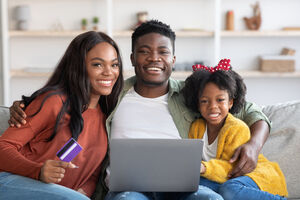 Black woman wearing cap carrying thermo backpack holding credit card and smartphone standing against blue background in studio