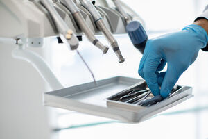 Black businessman in suit using tablet sitting at table with coffee cup in office
