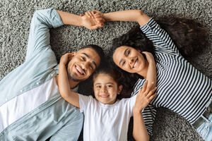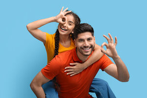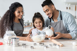 Black couple holding jar of food product checking expiration date while standing together with shopping cart in supermarket