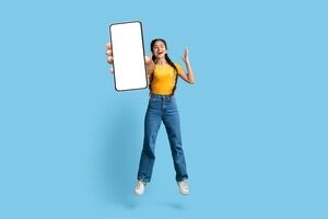 Smiling bearded Black businessman in suit pointing at smartphone in his hand standing in office