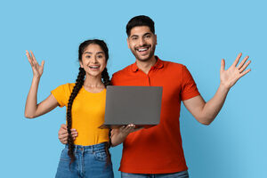 Cheerful Black businessman in suit raising closed fists looking at laptop screen celebrating success sitting at table in office