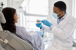 Black male doctor in white robe with stethoscope on shoulders pointing at smartphone in his hand standing in hospital