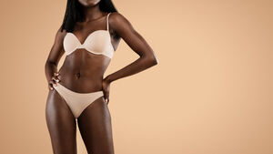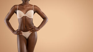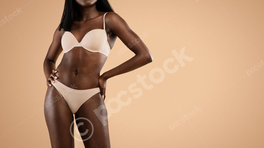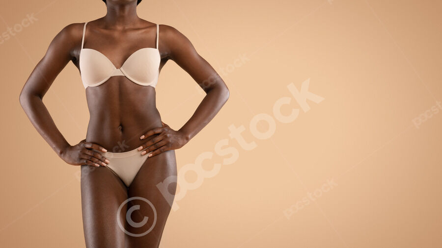 Cropped image of Black woman in nude underwear standing with her hands on her waist against beige background in studio