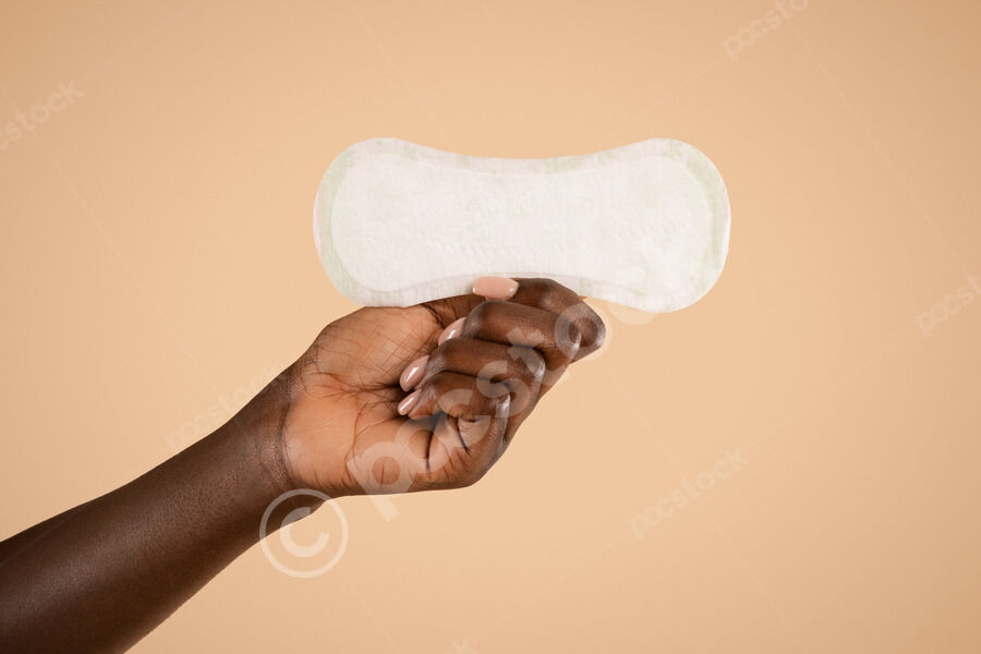 Close-up of hand of Black woman holding daily pad over beige background in studio