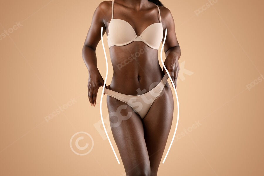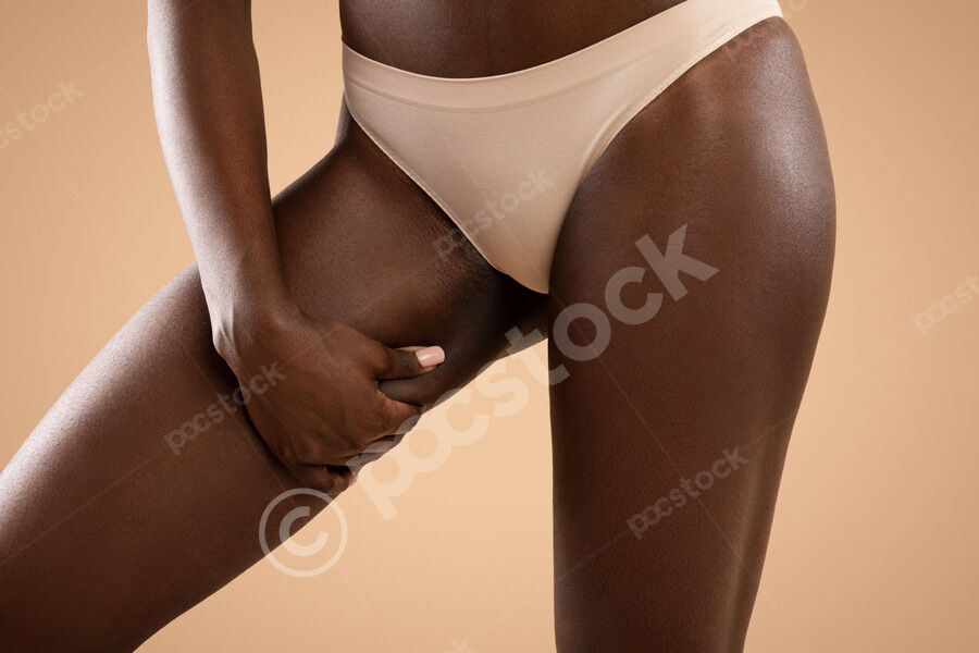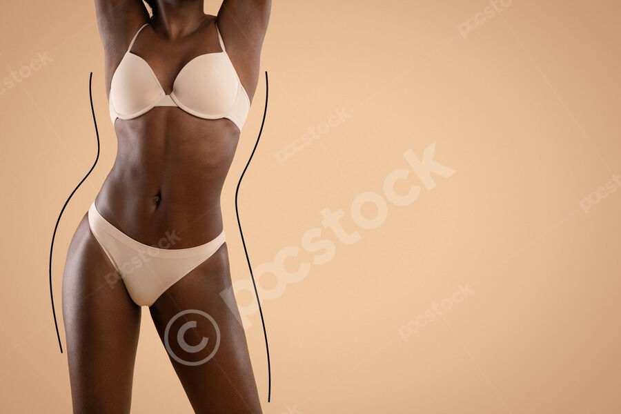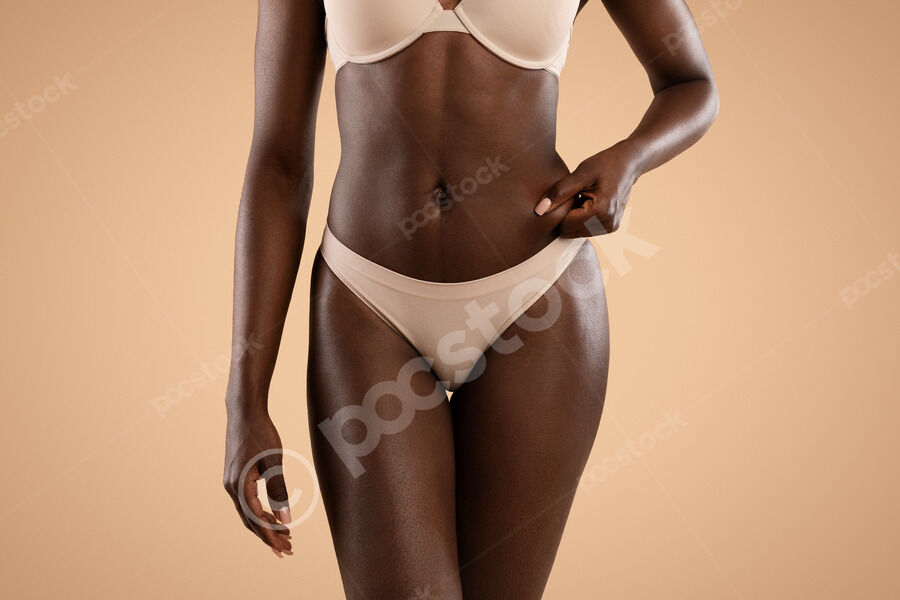 Cropped image of Black woman in nude panties showing excessive fat on her hips while standing against beige background in studio