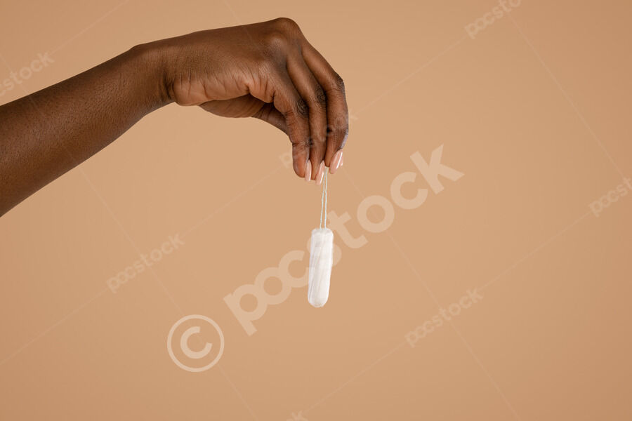 Close-up of hand of Black woman holding tampon over beige background in studio