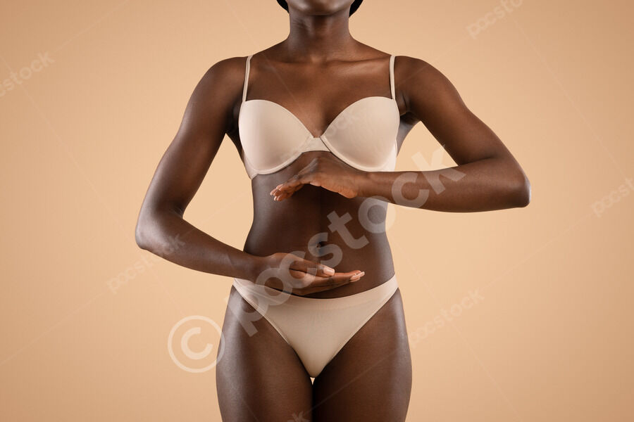 Cropped image of Black woman in nude underwear showing excessive fat on her belly while standing against beige background in studio