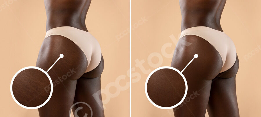 Collage of Black woman in nude panties showing before and after treatment for hips stretch marks while standing against beige background in studio