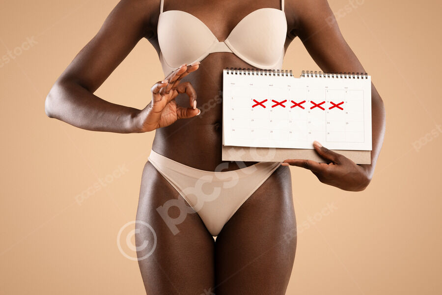 Cropped image of Black woman in nude underwear holding period calendar with marked days and showing okay hand gesture while standing against beige background in studio