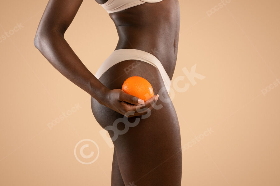 Cropped image of Black woman in nude underwear holding orange by her hips while standing against beige background in studio