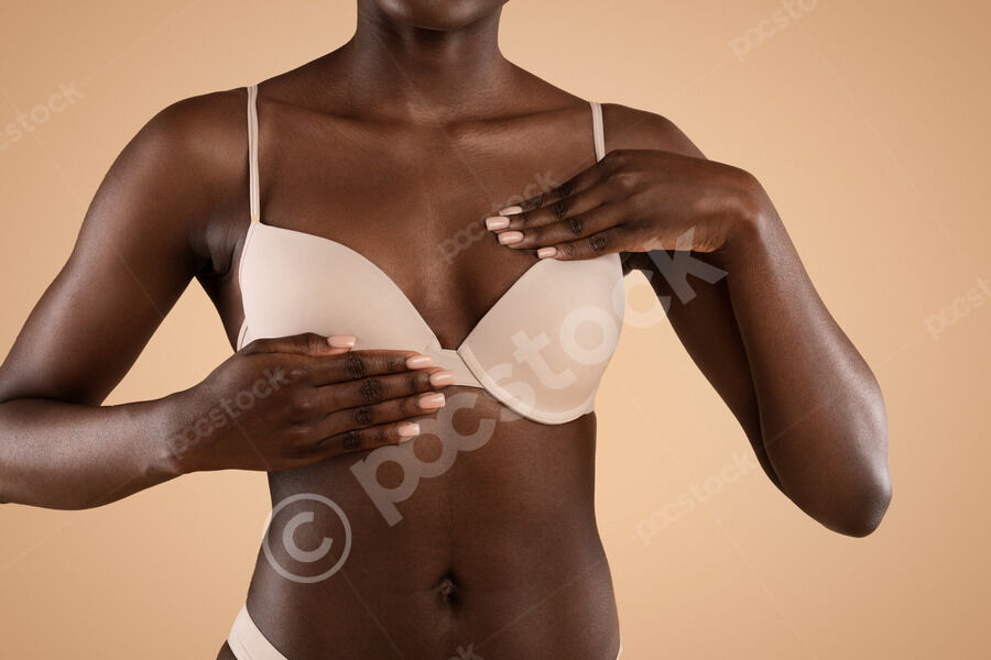 Cropped image of Black woman in nude bra examining her breast for cancer prevention while standing against beige background in studio