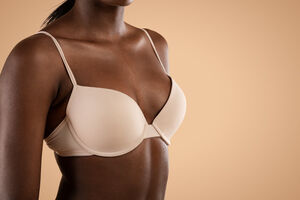Cropped image of Black woman in nude bra standing against beige background in studio
