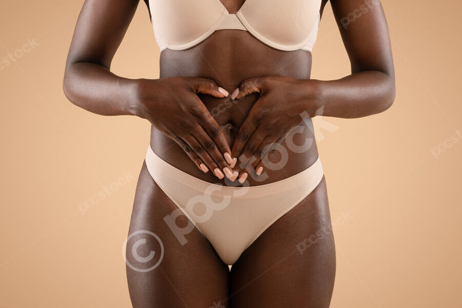 Cropped image of Black woman in nude underwear holding palms in heart-shaped symbol on her belly while standing against beige background in studio