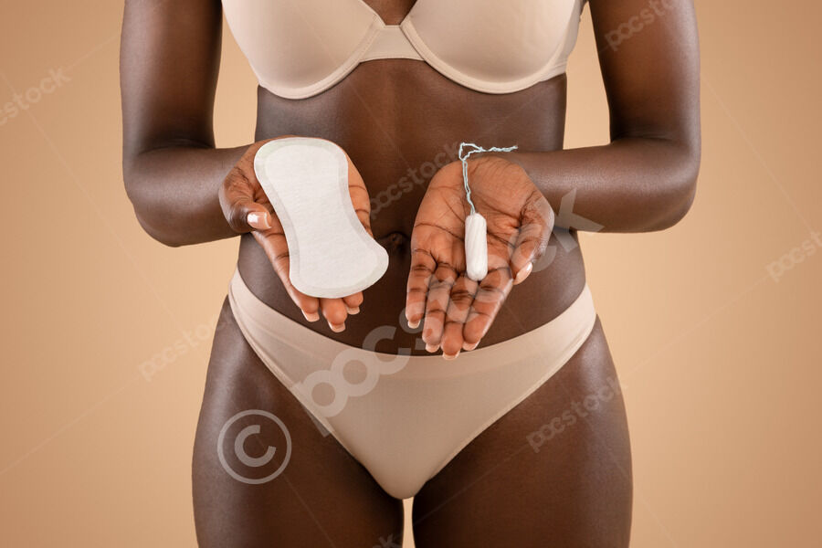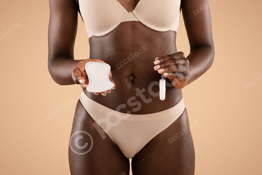 Cropped image of Black woman in nude underwear holding tampon and clean menstrual pad while standing against beige background in studio