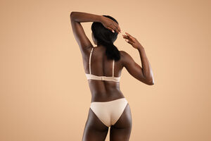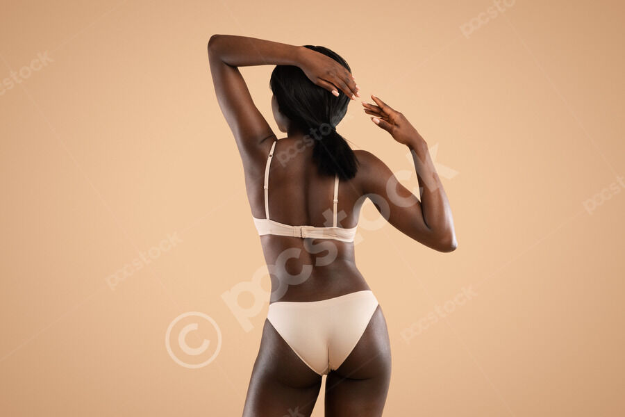 Cropped image of Black woman in nude panties standing sideways against beige background in studio