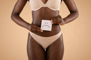 Cropped image of Black woman in nude underwear holding card with sad smile by her belly while standing against beige background in studio