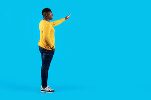 Black man with closed fist standing near scared wife and daughter hugging while sitting together on sofa in living room at home