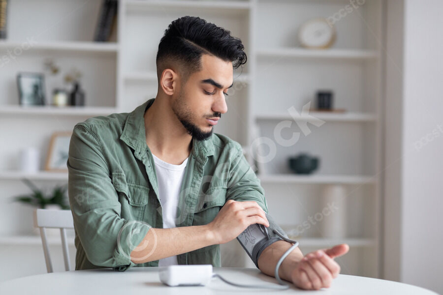 Serious Arab man measuring blood pressure with tonometer sitting at table at home