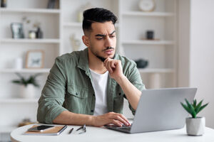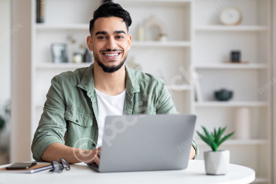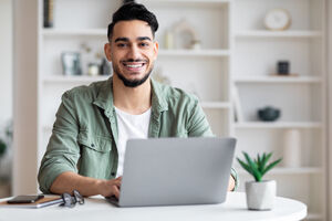 Smiling Arab man leaning chin on closed fist while using laptop sitting at desk at home