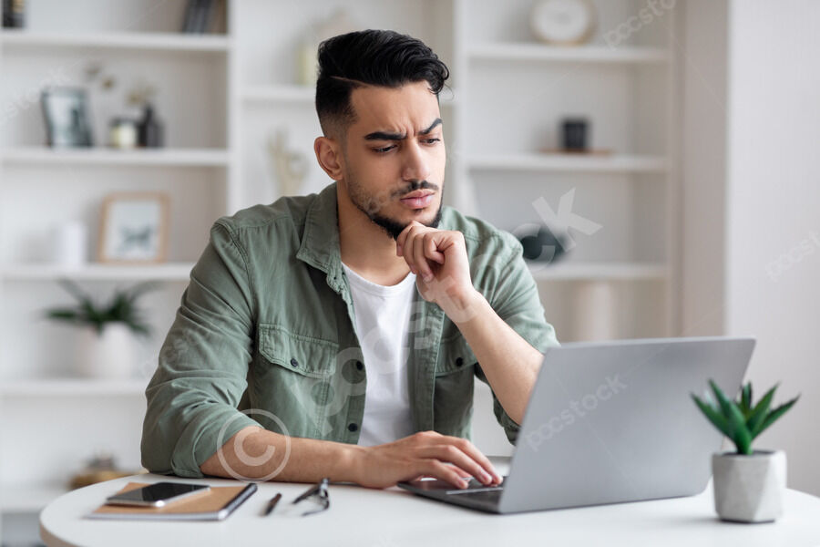 Worried Arab man gesturing hand looking at documents sitting at table with laptop at home