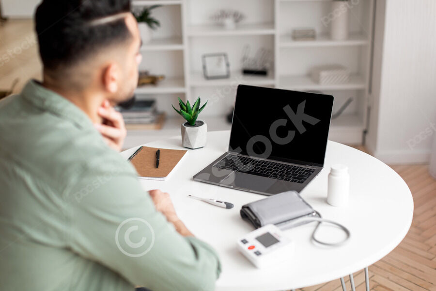 Sick Arab man checking his throat looking at laptop screen sitting at table at home
